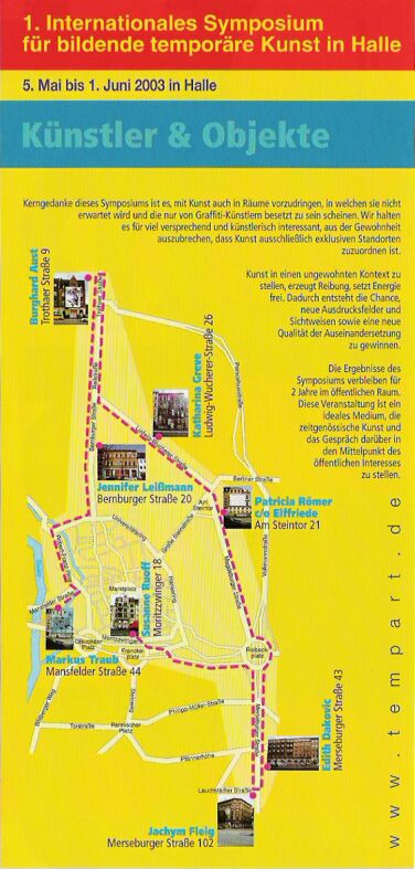 ![]() Leerstehende Gebäude werden zum Träger für Kunstwerke Ein Projekt des Kulturwerkes des Verbandes bildender Künstler in Sachsen Anhalt. Für diese internationale Ausschreibung bewarben sich ca. 200 Künstler/innen aus aller Welt. Davon wurden Acht ausgewählt ihr eingereichtes Projekt innerhalb von einem Monat direkt vor Ort zu verwirklichen. Ich habe mich sehr gefreut, dass ich sofort nach meinem Studium an diesem Arbeitsstipendium teilnehmen durfte. Der eine Monat war eine aufregende und für mich als Jüngste der Gruppe sehr lehrreiche Zeit. Weitere Informationen über mein Projekt auf der folgenden Seite. Jennifer Leißmann Ungewöhnliche Aussichten Der Blick von Draußen nach Draußen |